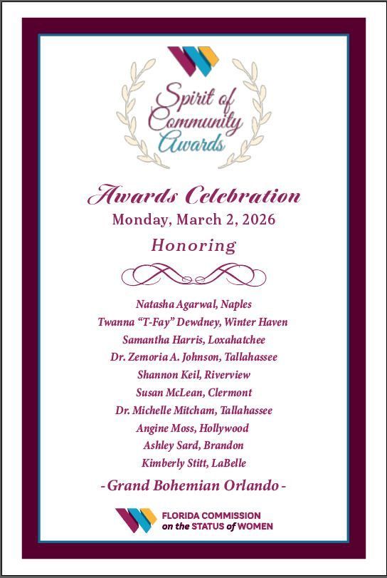 The Spirit of Community Awards recognizes those who have improved the lives of women in Florida and have served as positive role models for women and girls in their community. The recipients of the FCSW Spirit of Community Awards are the embodiment of dedicated community service. Learn more at https://fcsw.net/spirit-of-community-awards/